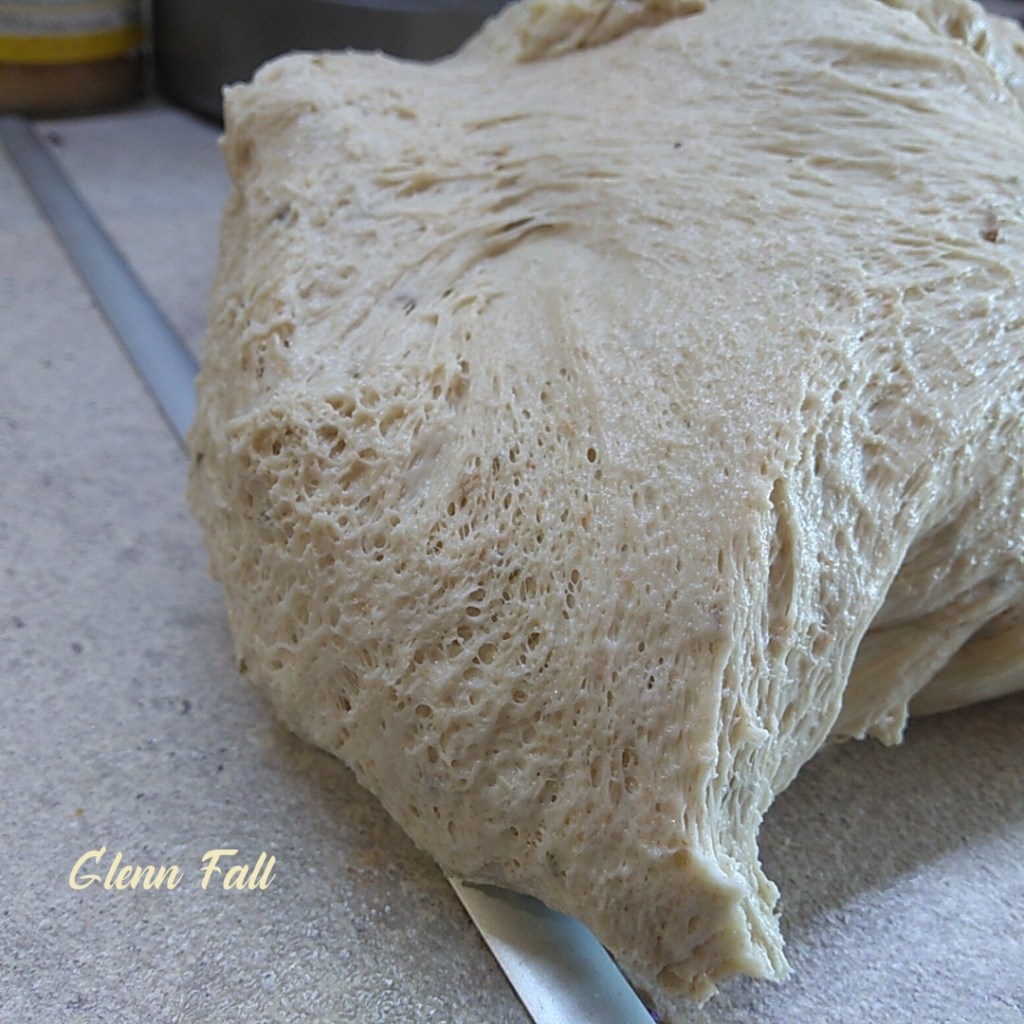 The kneading process is rather simple. Mix everything together. You may have already heard that it is better to add fat later when doing a fermented dough. The fat coats the gluten that develops in the mixture and thus makes it harder to get elastic dough. In this recipe, I have tried adding the oil in various stages and saw no difference. The amount of fat is not that high to cause a major problem.